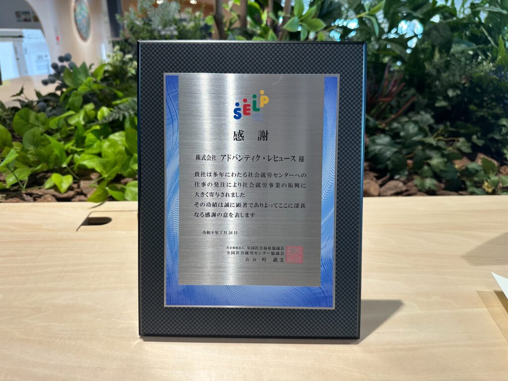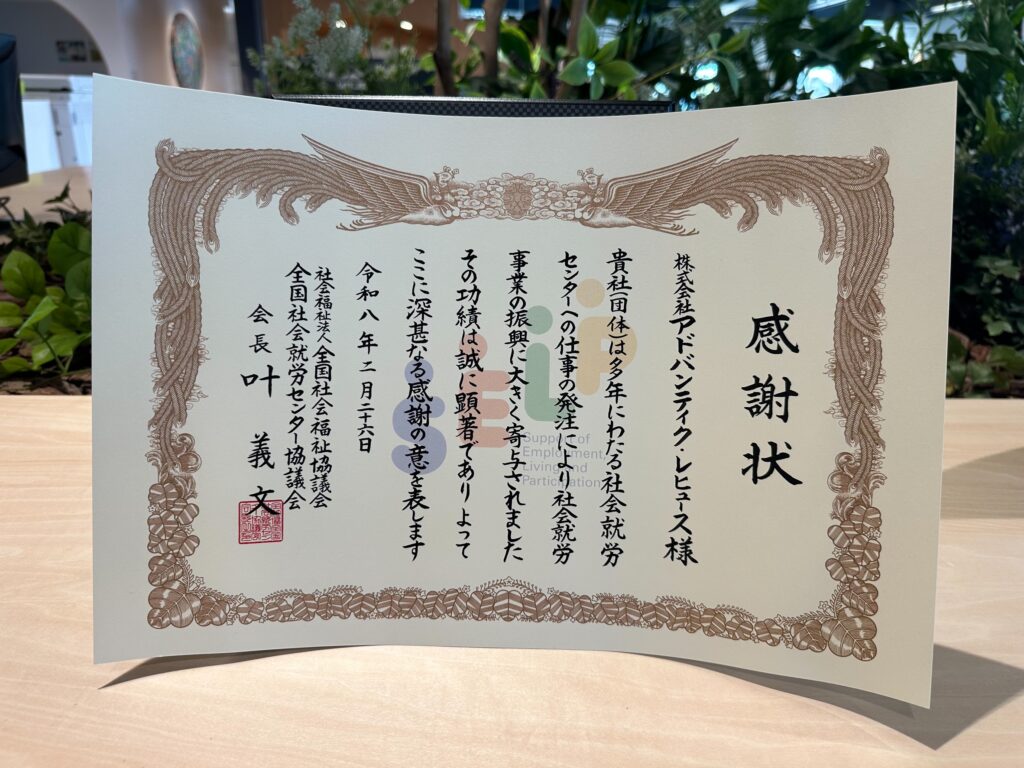 本表彰は、就労支援施設への発注実績が高く、かつ長年にわたって継続している企業に贈られるものです。当社のこれまでの発注規模は、表彰基準を大きく上回る水準で推移しており、一過性ではない「安定した仕事の提供」を通じて、施設の運営や利用者の方々の自立を力強く支えてきた実績が認められました。
